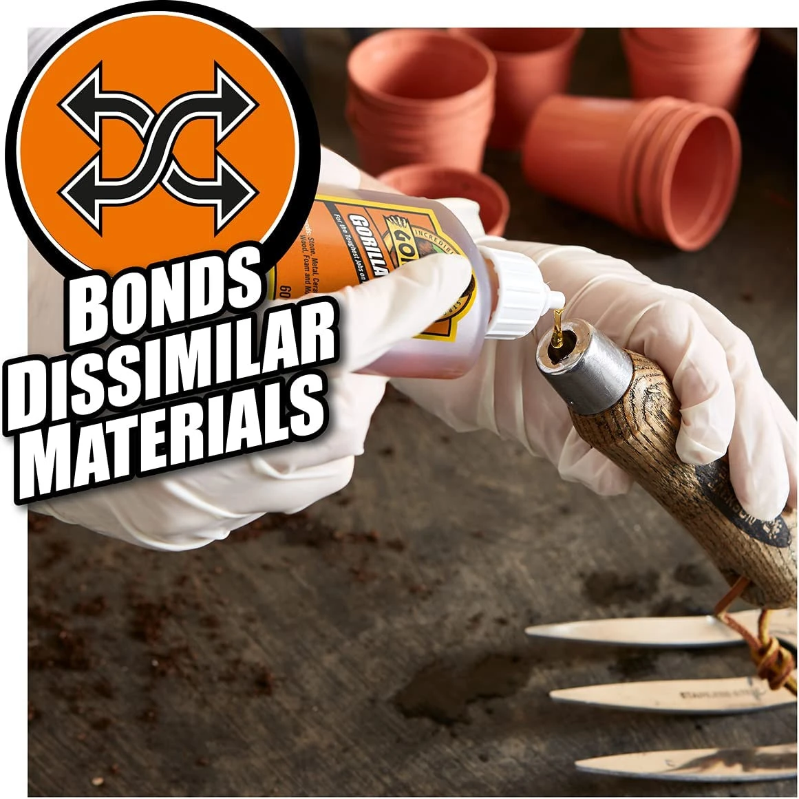 L’Original Gorilla Glue est une colle 100% imperméable et résistante aux températures extrêmes. Elle est réputée pour sa polyvalence et sa force incroyable. Sa formule de polyuréthane s’active par l’humidité. Elle se dilate à l’intérieur des matériaux pour créer une adhérence durable et parfaitement étanche. Elle permet de coller différents matériaux, ce qui signifie qu’elle peut être utilisée pour une grande variété de travaux, à l’intérieur comme à l’extérieur : pierre, métal, céramique, verre, bois, mousse et bien plus encore !