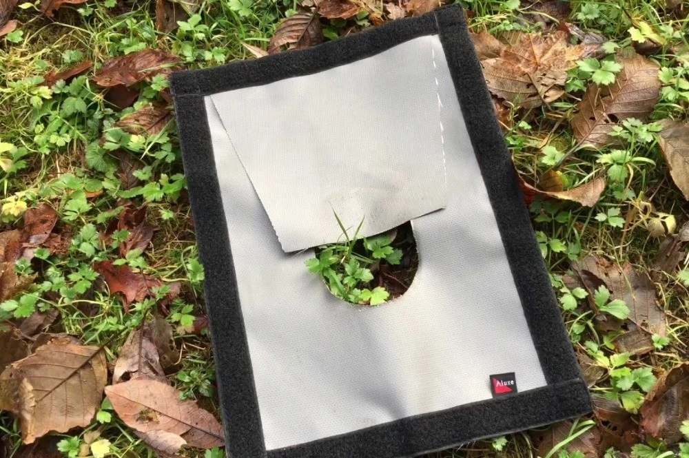 La trappe est réalisée en fibre de verre enduit de silicone et elle dispose de bande velcro sur son pourtour, sur les deux faces. Elle est prédécoupée en son milieu, d’un ovale de11,5 x 7 cm. Il est possible d’agrandir l’ouverture avec une simple paire de ciseaux.