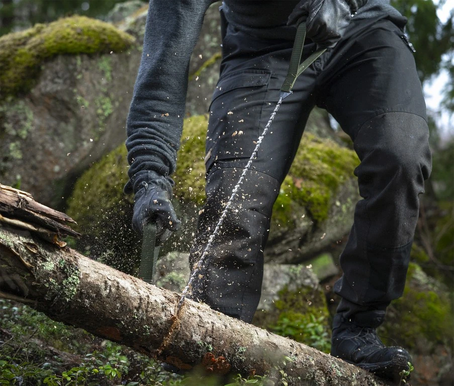 La Savotta Pocket Saw est une scie de poche disposant d’une chaîne identique à celles installées sur les tronçonneuses thermiques. A la place du moteur, elle dispose de deux poignées durables en polyester offrant une bonne prise en main.