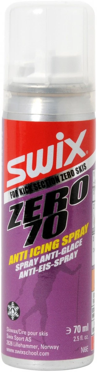 Le Zero 70 de Swix est un spray qui empêche la formation de givre ou de glace sous les patins ou la zone des écailles.